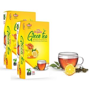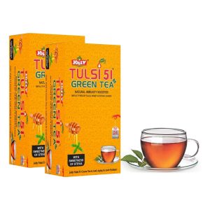 JOLLY ORGANIC GREEN TEA with 5 types of Tulsi is a wonderful blend of Green Tea manufactured in a unique way, at the high altitude purely ORGANIC Tea gardens of Himalayas blended with five different types of Tulsi (Rama Tulsi, Vishnu Priya, Kala Tulsi, Bisva Tulsi & Basil sweet lemon) which gives it a very unique flavor & aroma with additional health benefits. Daily consumption of Jolly Organic Green Tea blended with 5 types of Tulsi leads a healthy lifestyle, Boost Immunity & inhibits the harmful effects of free radicals, preventing damage to healthy cells and tissues. It also has a natural healing power for numerous diseases.